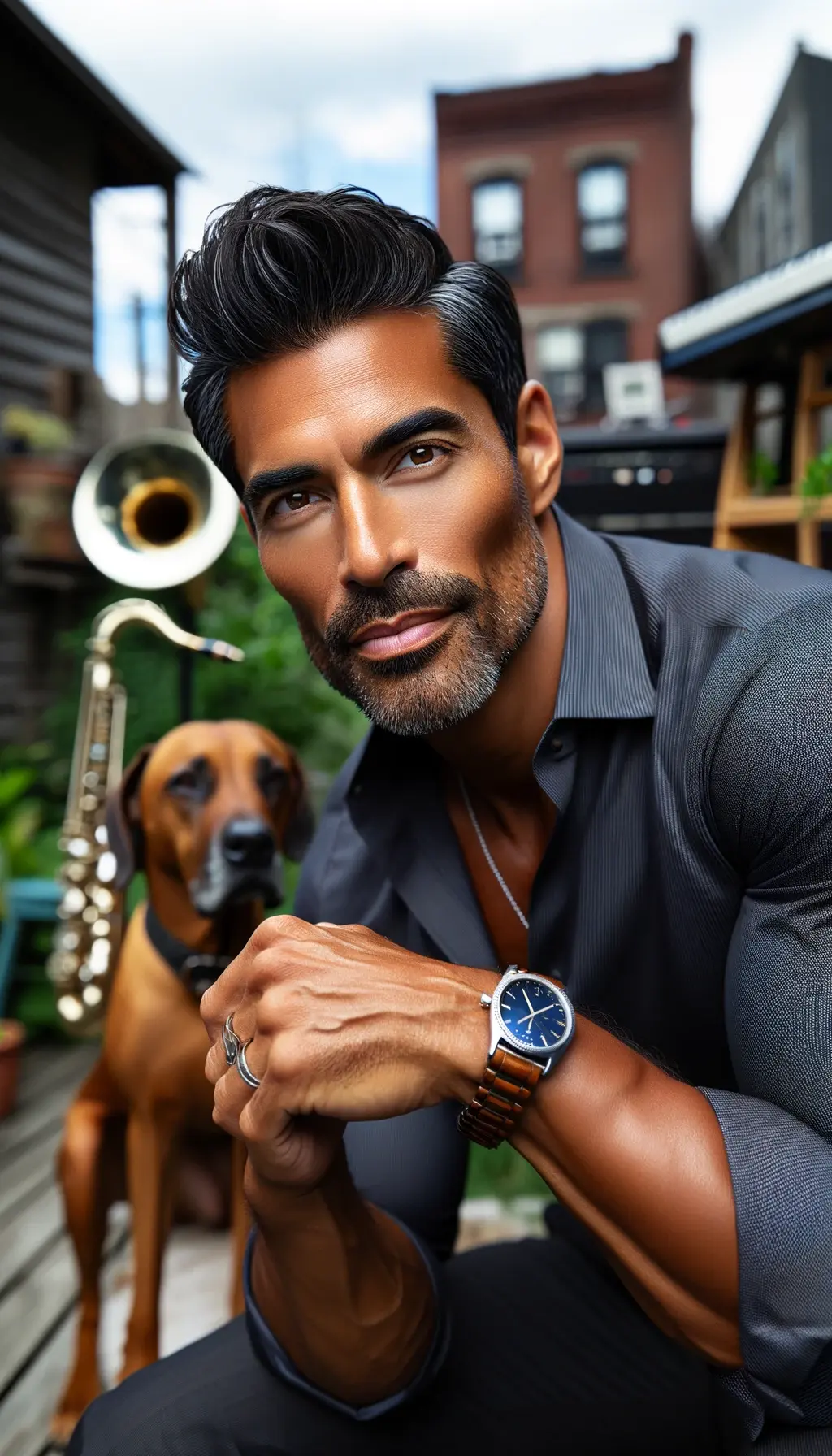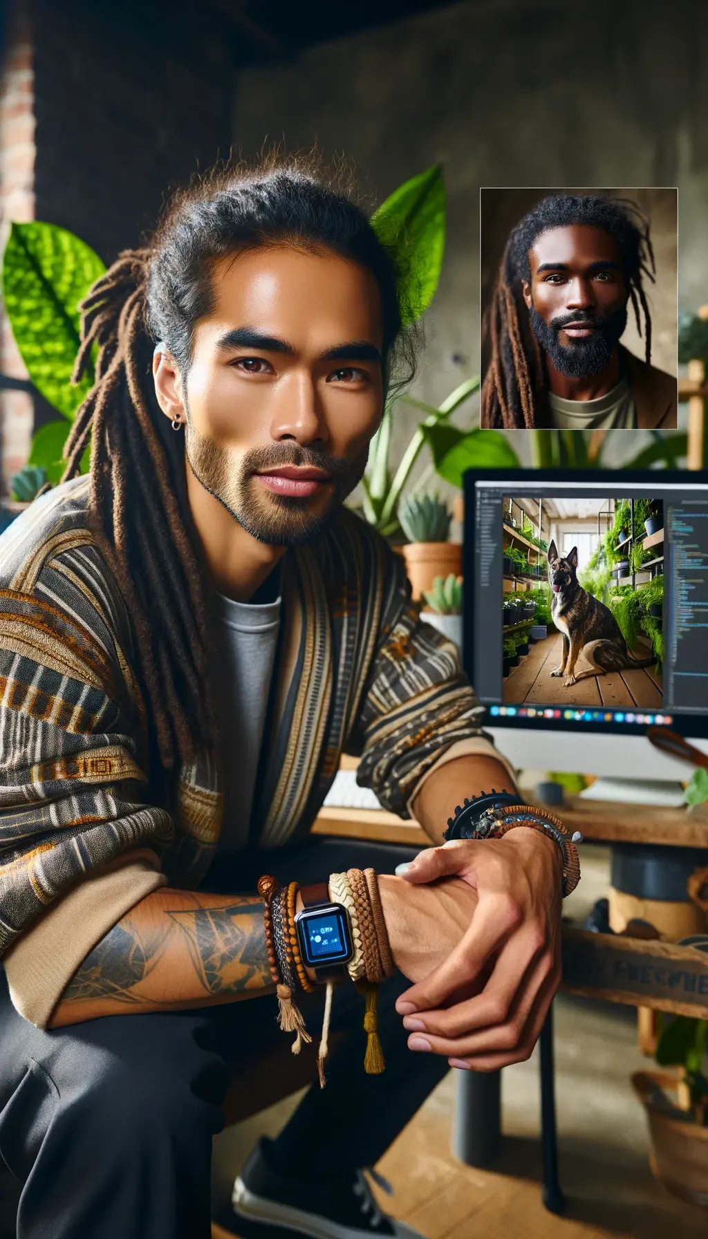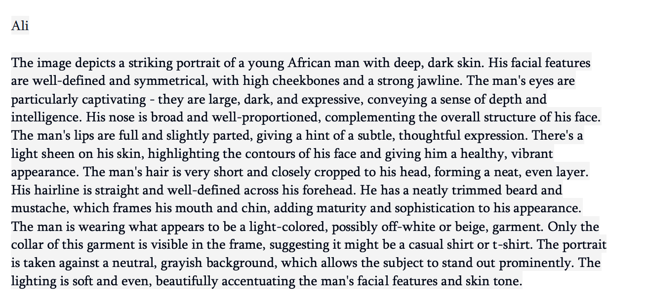 To generate the picture descriptions needed by the RAG PoC to answer questions about each picture, we fed the pictures back to an LLM on AWS Bedrock and asked for a detailed description. Here’s an example of Ali, one of the generated faces.