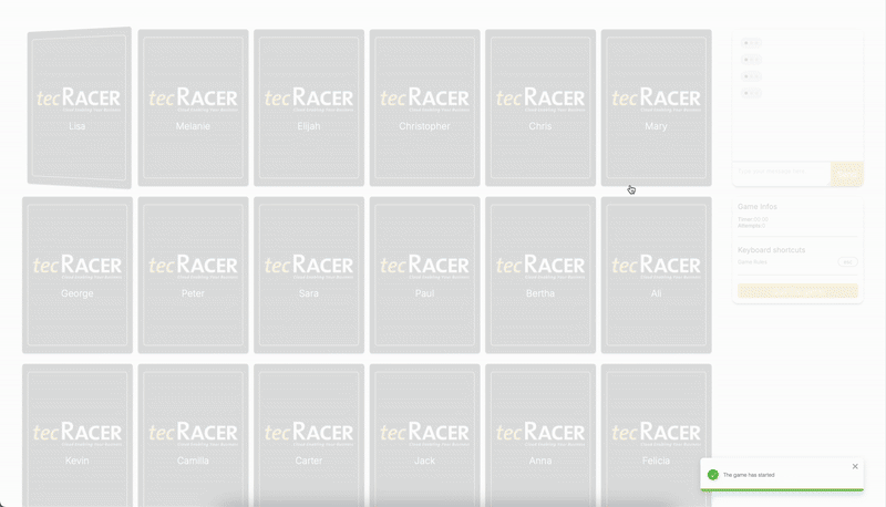 This frontend is also the result of extensive user testing. We believe the game rules had to be clear from the start. It took us multiple iterations until we were satisfied with the result. Still, thanks to our dynamic colleagues within tecRacer Group, we could find sufficient test subjects for numerous iterations of user testing.