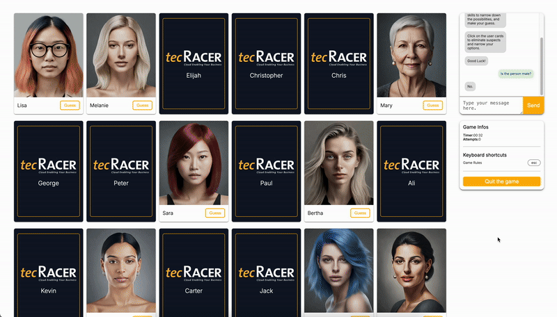 The frontend is straightforward yet effective. Once the game is started, the user is presented with a grid of faces. The player can ask closed questions (yes or no answers only) in the chatbox on the upper-right side to narrow down the randomly selected person we’re looking for. Clicking on the faces causes the cards to flip, similar to the original board game.