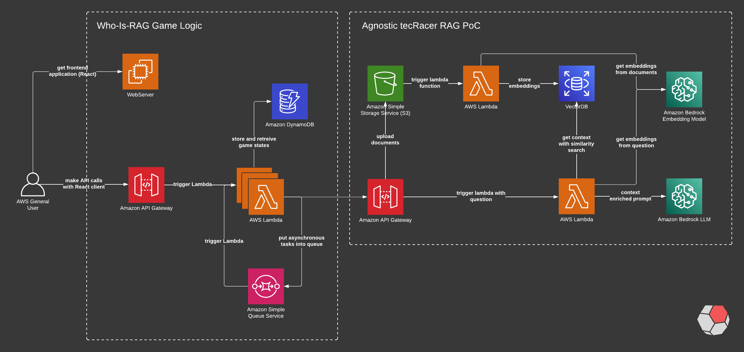 The previously mentioned RAG PoC is data agnostic. This means that the PoC indifferent to the nature of the provided content. Any document uploaded to the S3 bucket is used to generate the embeddings. The game on the left side is just overlayed. We deliberately used AWS Serverless components, because they facilitate the highly efficient creation of business logic and are very cost-effective. Thus the whole game logic is handled by a small number of AWS Lambda Functions, an SQS to make certain API calls asynchronous and a DynamoDB table to store data about the game.